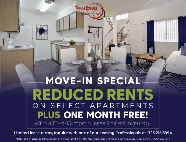 Twain Estates is located in the heart of Las Vegas, minutes away from the strip. Relax in the refreshing pool or stop by the clubhouse for access to our business and fitness center. Mature landscaping throughout with large shade trees overhanging picnic areas. Our community offers a unique 2 story townhome with 2 large bedrooms and 2 1/2 baths.